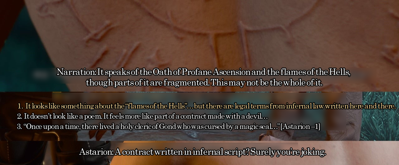 When playing as other races, the game simply has the player draw the markings on the ground and move on. However, if the player character is a tiefling, they can read Infernal and recognize that the text refers to the “flames of the Hells” along with various legal terms from infernal law. Seeing these kinds of detailed choices and reactions makes me wonder just how many possibilities Baldur’s Gate 3 accounted for. Moments like this make multiple playthroughs feel almost inevitable.